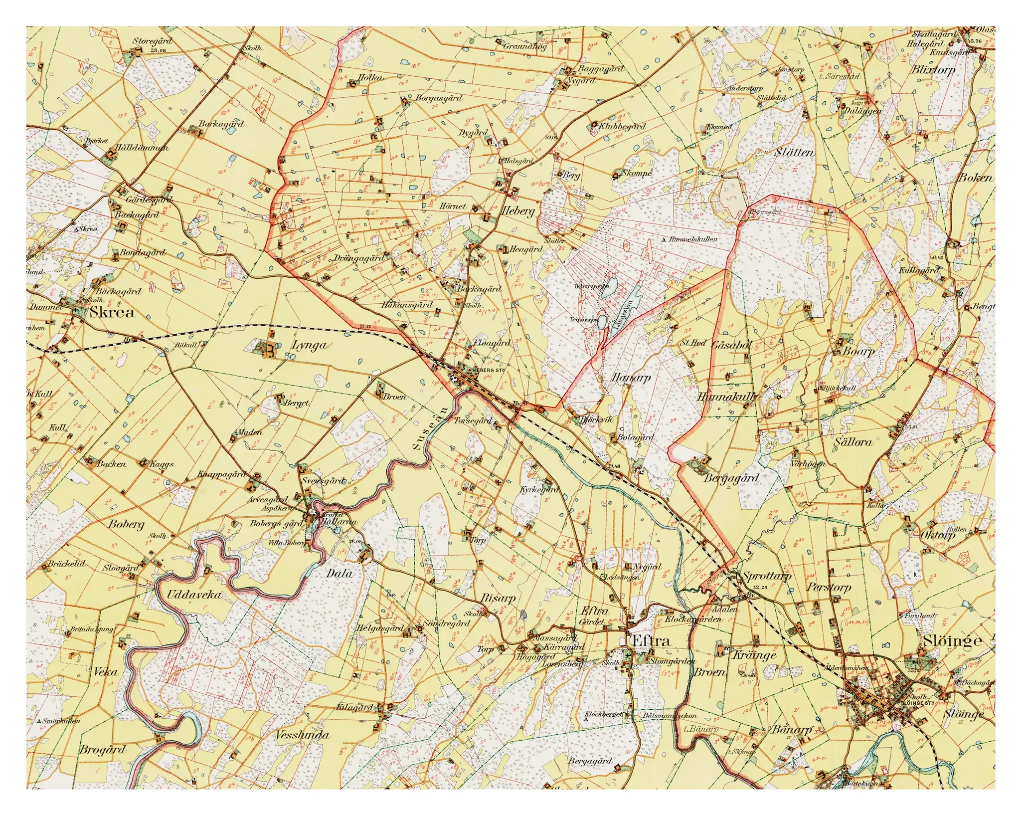 Denna historiska karta över trakten kring Slöinge är hämtad från den häradsekonomiska kartan från 1924. Den häradsekonomiska kartan var den första kartan i Sverige som avsåg att dokumentera Sverige i detalj. Här finns detaljer som byggnader, kommunikationer, åkrar och ängar samt sjöar och vattendrag med.