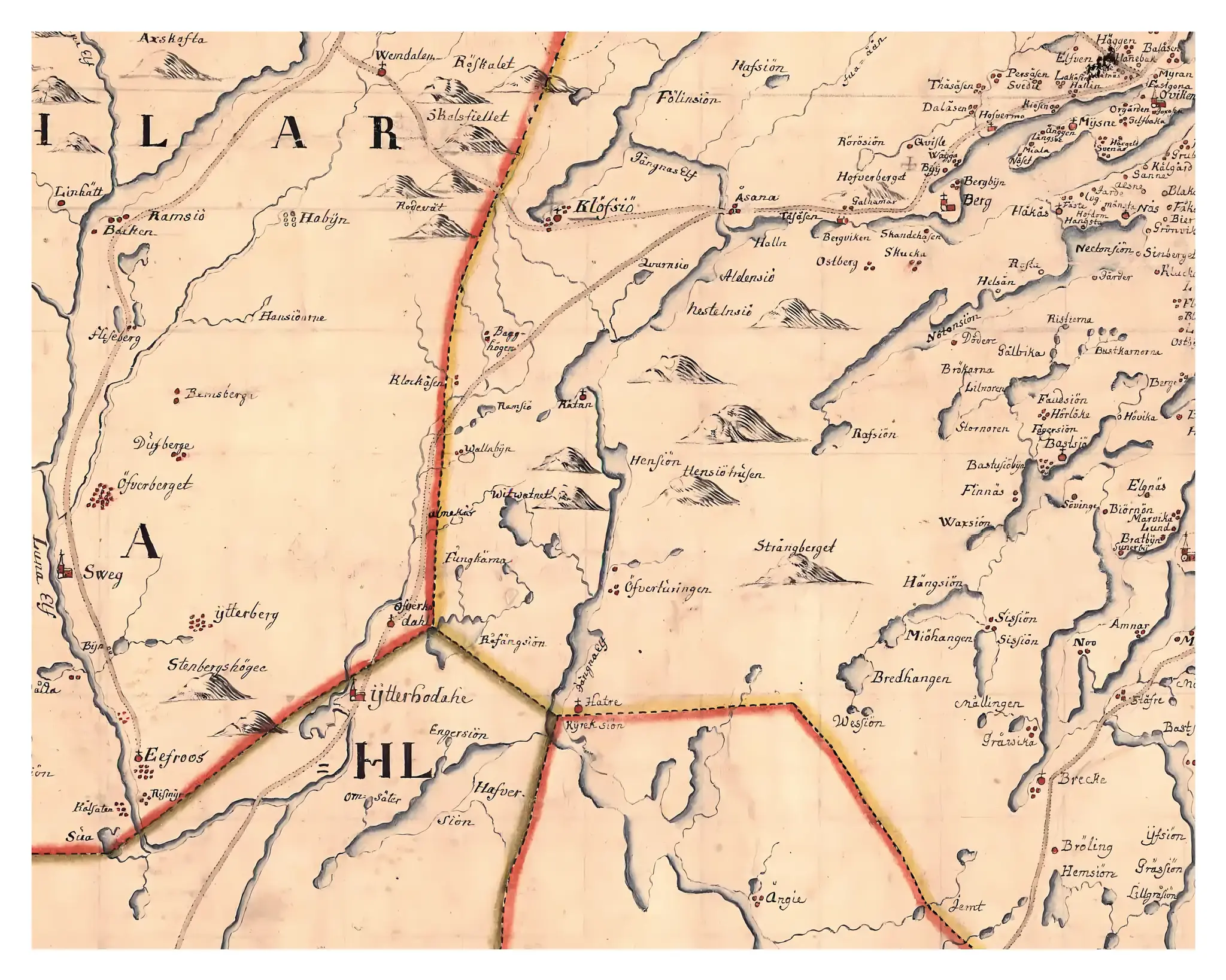 Historisk karta från 1710, med centrering över Rätan och Överturingen. Kartan är ett utsnitt från en större karta. Den är ritad av Christoffer Jacobsson Stenklyft.