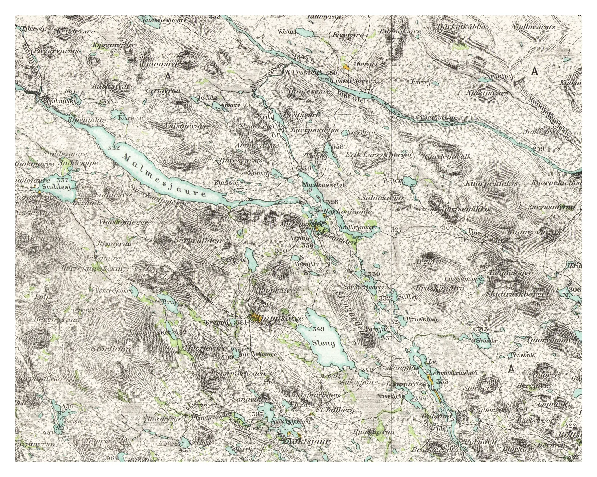 Byarna Tjappsåive och Auktsjaur redovisas också i kartan.