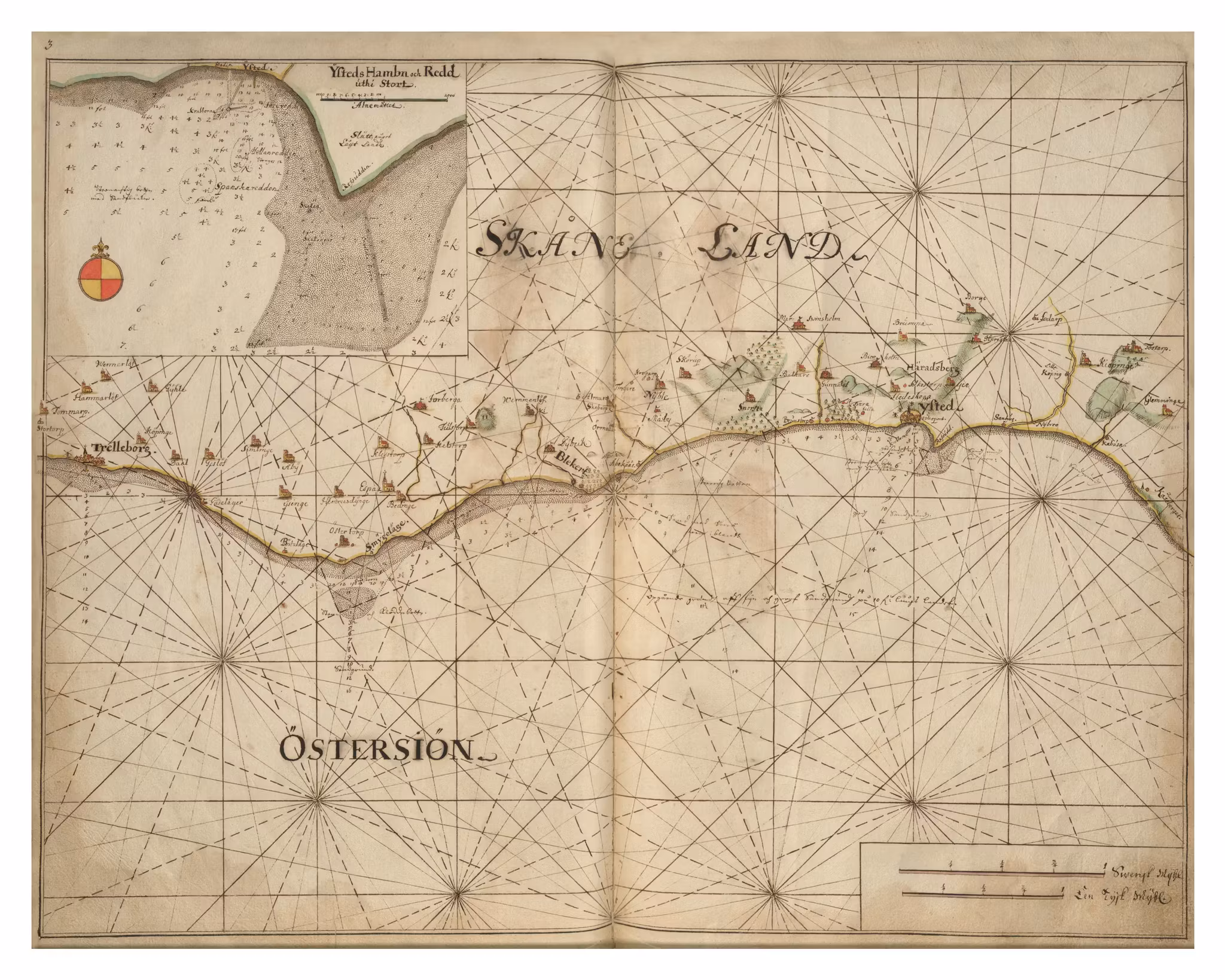 Historiskt sjökort över Skånes södra kust, år 1692.