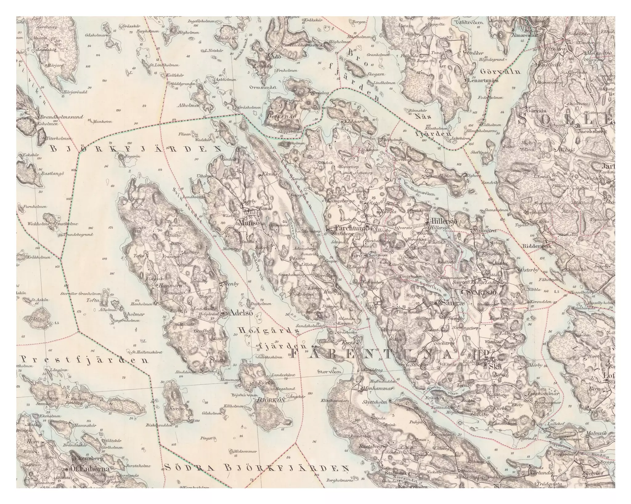 Den här fina kartan visar Mälaröarna Adelsö, Munsö och Färingsö så som de var organiserade år 1873. Kartan är ett utsnitt från en större karta, den så kallade generalstabskartan. Den framställdes främst för militära bruk.