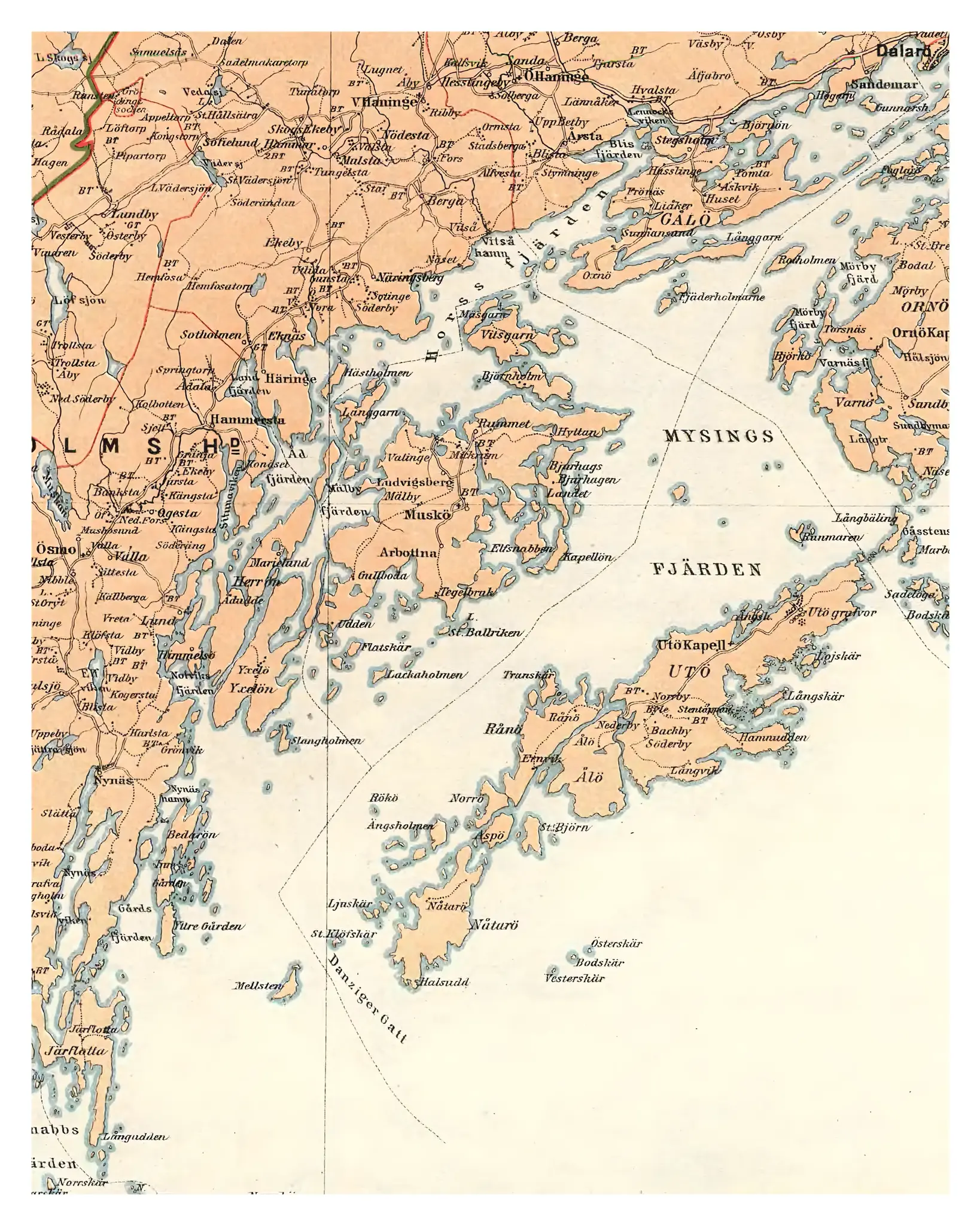 Vacker gammal karta över trakten kring Muskö och Utö i Stockholms län och skärgård, framställd av Generalstabens litografiska anstalt. Kartan trycks upp på vackert konstpapper i storleken 40x50 cm.