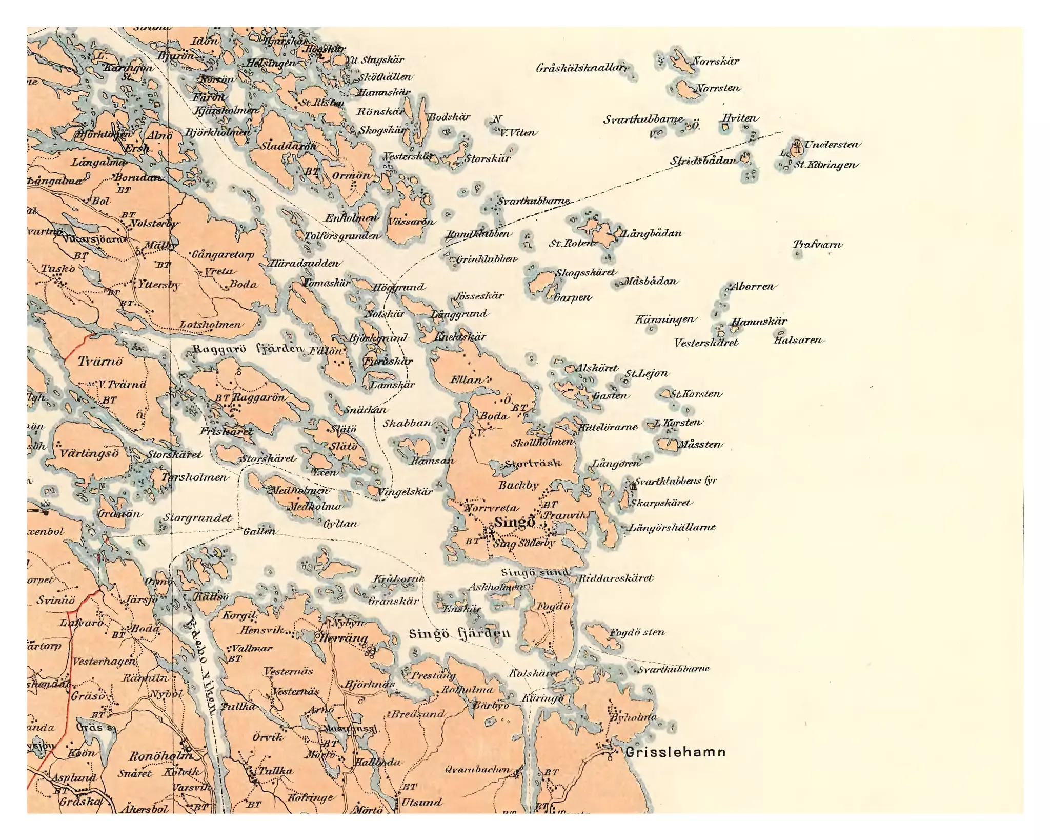 Historisk karta över Singö, år 1886 399 kr Storlek 40x50 cm I lager. Lägg i korgen Produktbeskrivning Recensioner Vacker gammal karta över trakten kring Singö och Fogdö i Stockholms län och skärgård, framställd av Generalstabens litografiska anstalt. Kartan trycks upp på vackert konstpapper i storleken 40x50 cm.Bildkälla: Riksarkivet