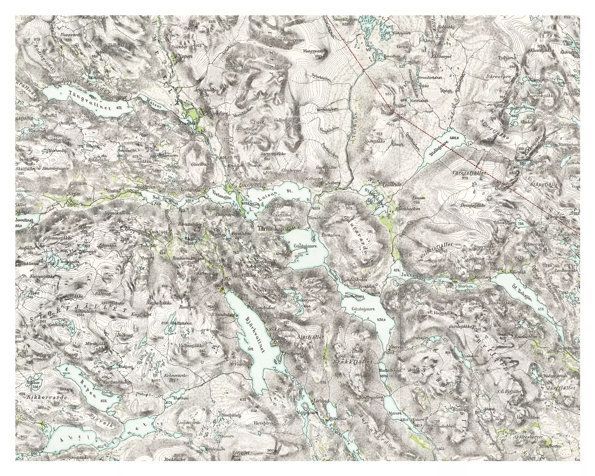Björkfors ägdes slutet av 1800-talet av en nybyggarfamilj. Tjugo år efter att kartan hade publicerats kom telegrafstation och post till byn, och i samband med det byttes namnet till Hemavan. På 1950-talet fick byn sitt första hotell och värdshus och blev då också officiellt en skidort. Här ser man byn Björkfors tillsammans med Tärnaby.