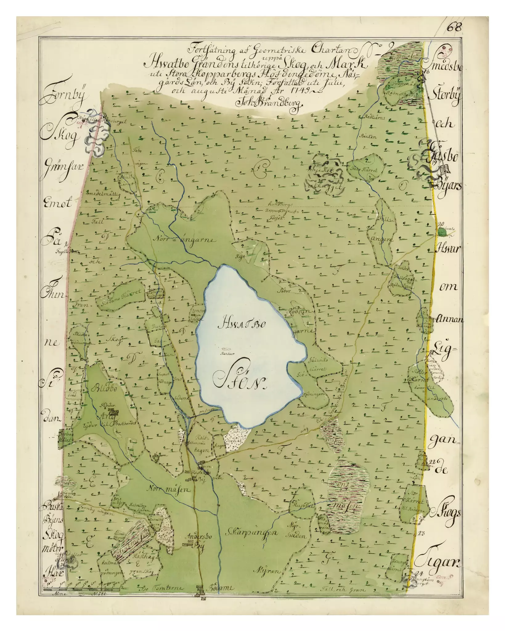 Historisk karta över Vatebo från år 1749 i storleken 40x50 cm. (Kartritare: Johan Brandberg)